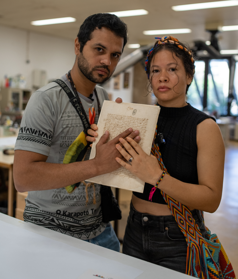 Primeiro Contato: Olinda Tupinambá e Ziel Karapotó, primeiras pessoas indígenas e nordestinas a tocarem a Carta de Pêro Vaz de Caminha, 525 anos depois da sua escritura. Arquivo Nacional da Torre do Tombo, maio de 2025. Impressões digitais, 100x70cm. Fotografias por Violena Ampudia. Direitos reservados.